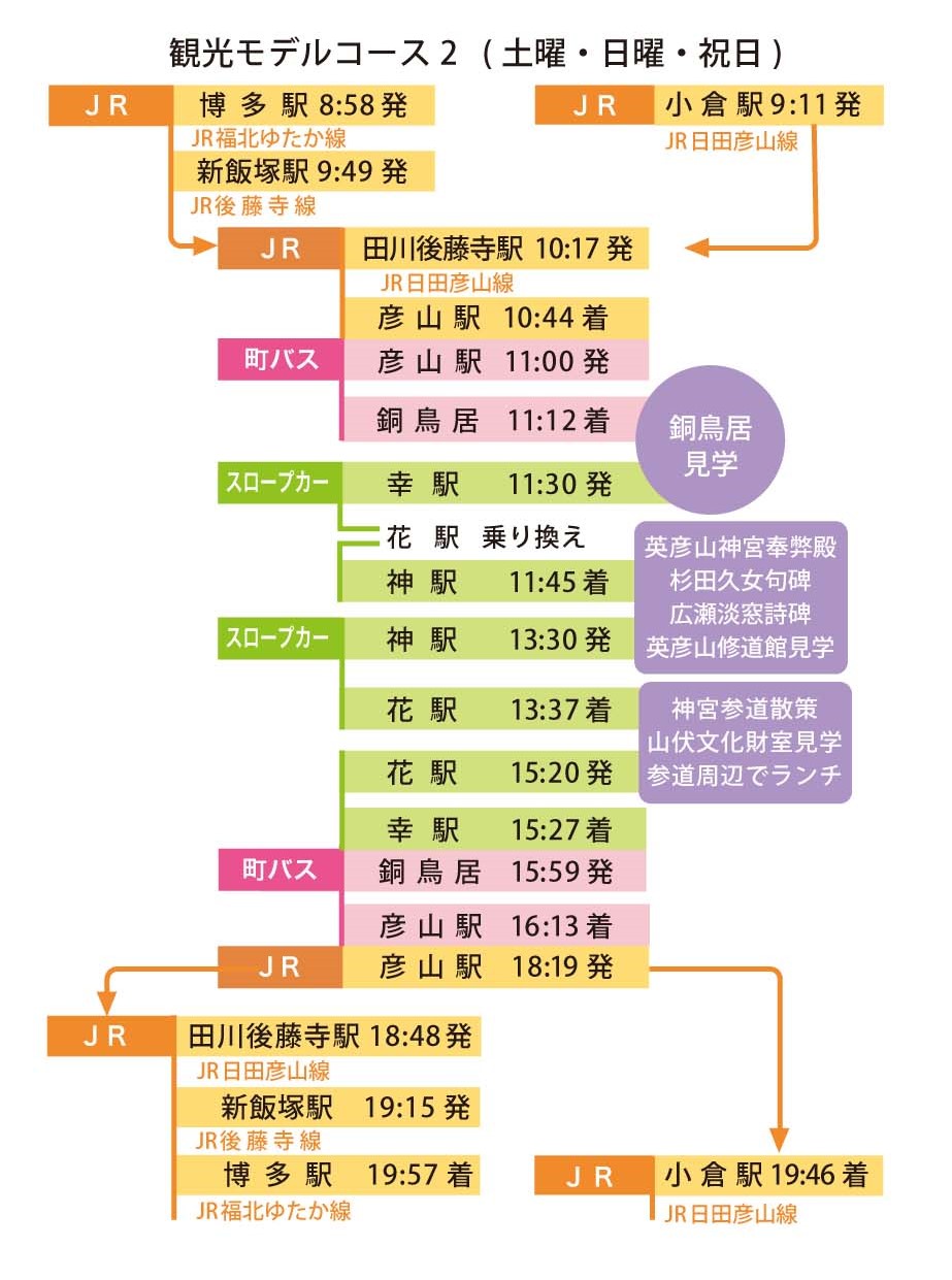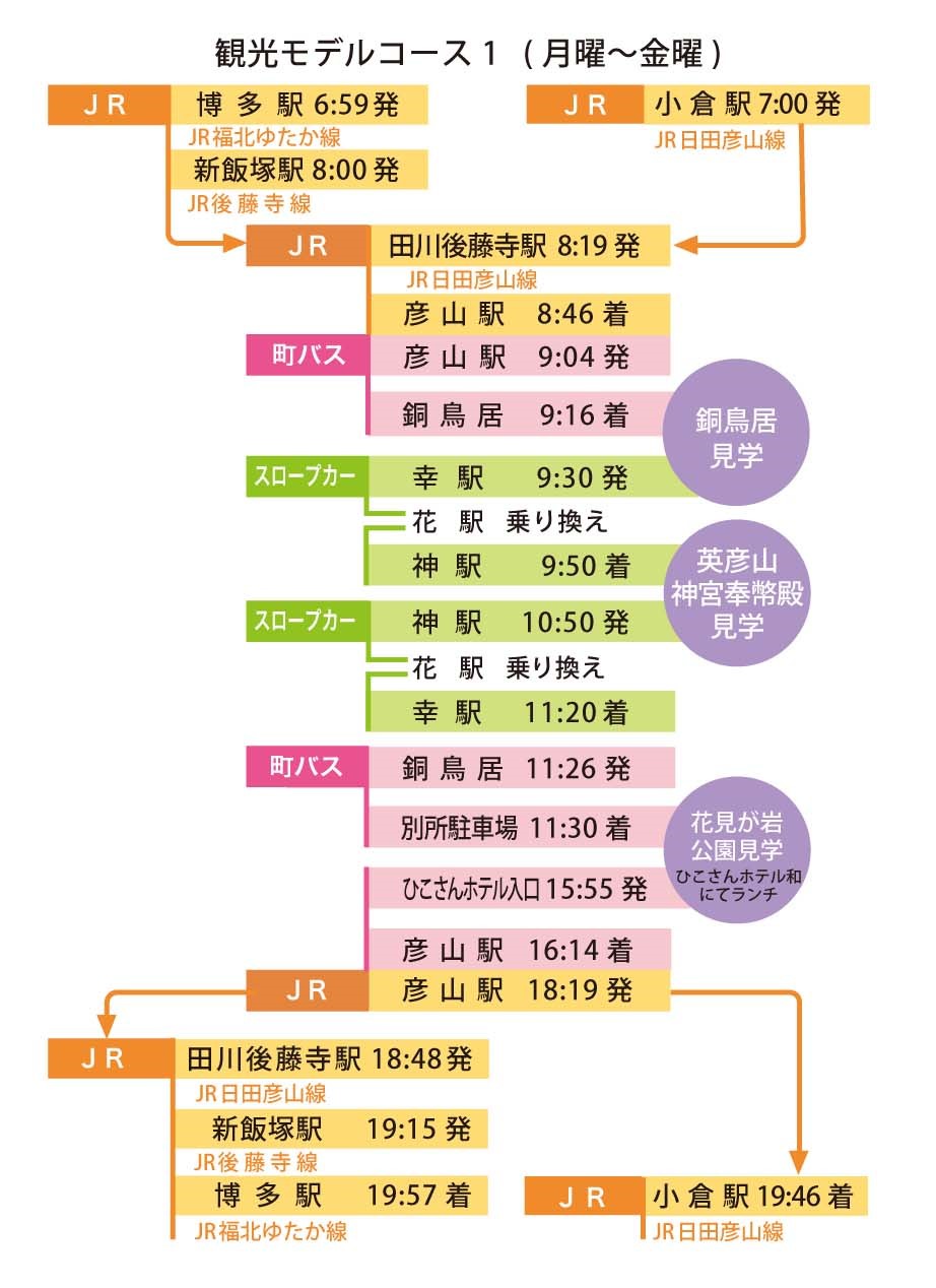 土日祝日に英彦山の定番観光コースの散策を楽しむプランです。