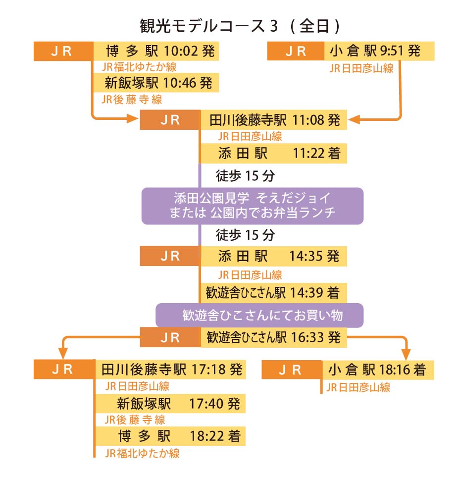 博多駅よりJR福北ゆた線・筑豊本線で新飯塚。JR後藤寺線経由日田彦山線で添田駅へ。