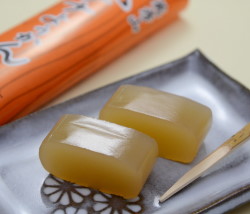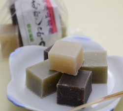 周りが固めの昔懐かしい羊羹。一口サイズで茶、本練り、白餡の3種類の味が楽しめます。 |