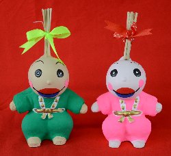 | 添田町のマスコットキャラクター、ひこちゃん とゆずちゃんの人形です。こちらも土鈴同様 粘土を素焼きして作られています。 (高さは約20cm) (ひこちゃん、ゆずちゃん各2種類あります) |